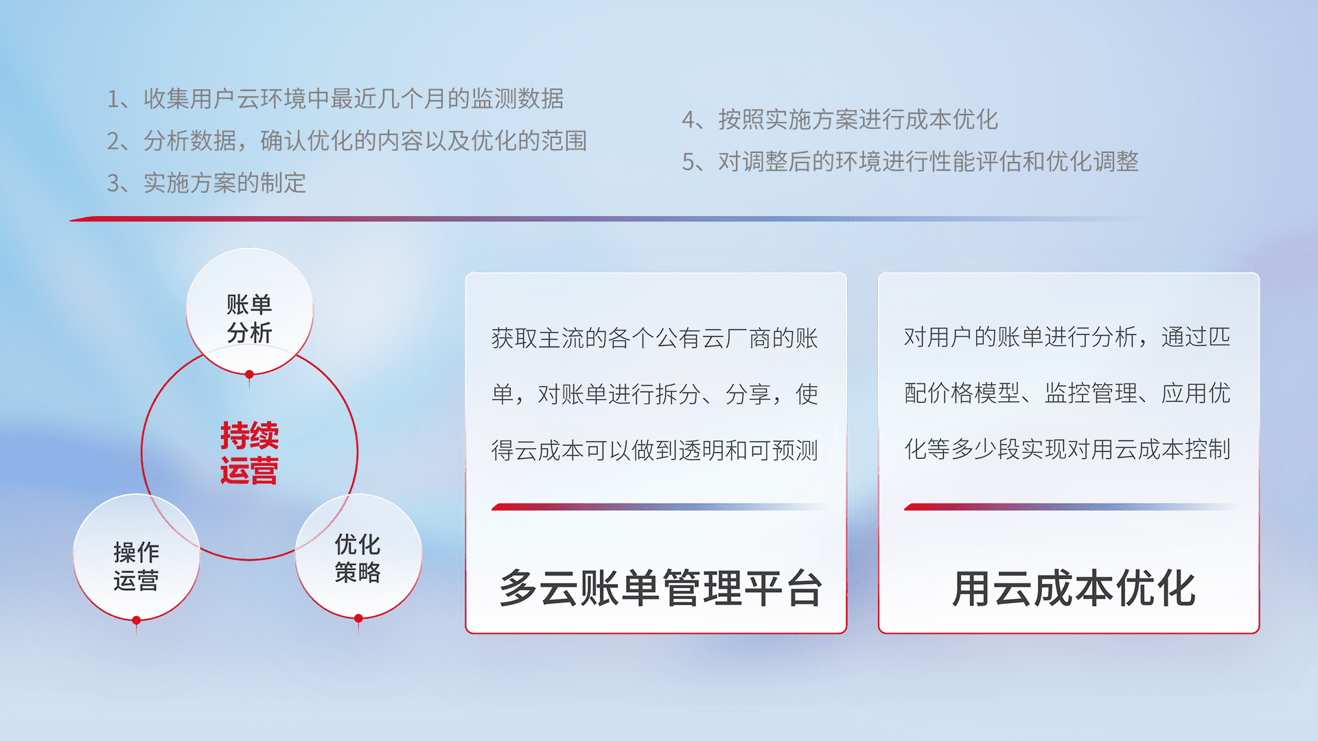 通过多云纳管,,,,以统一的资源数据模型把客户的云资源进行抽象和封装,,进而实现对多云资源的统一操作,,,保障云资源管理的可靠性、、稳定性与可用性。。。。量身定制化运维内容,,,,配置、、开发运维、、、、补丁管理、、、备份、、、、监控、、、、认证和访问管理、、审计和日常巡检等,,,保障在用云过程中的可靠度,,,稳定度以及高可用率。。