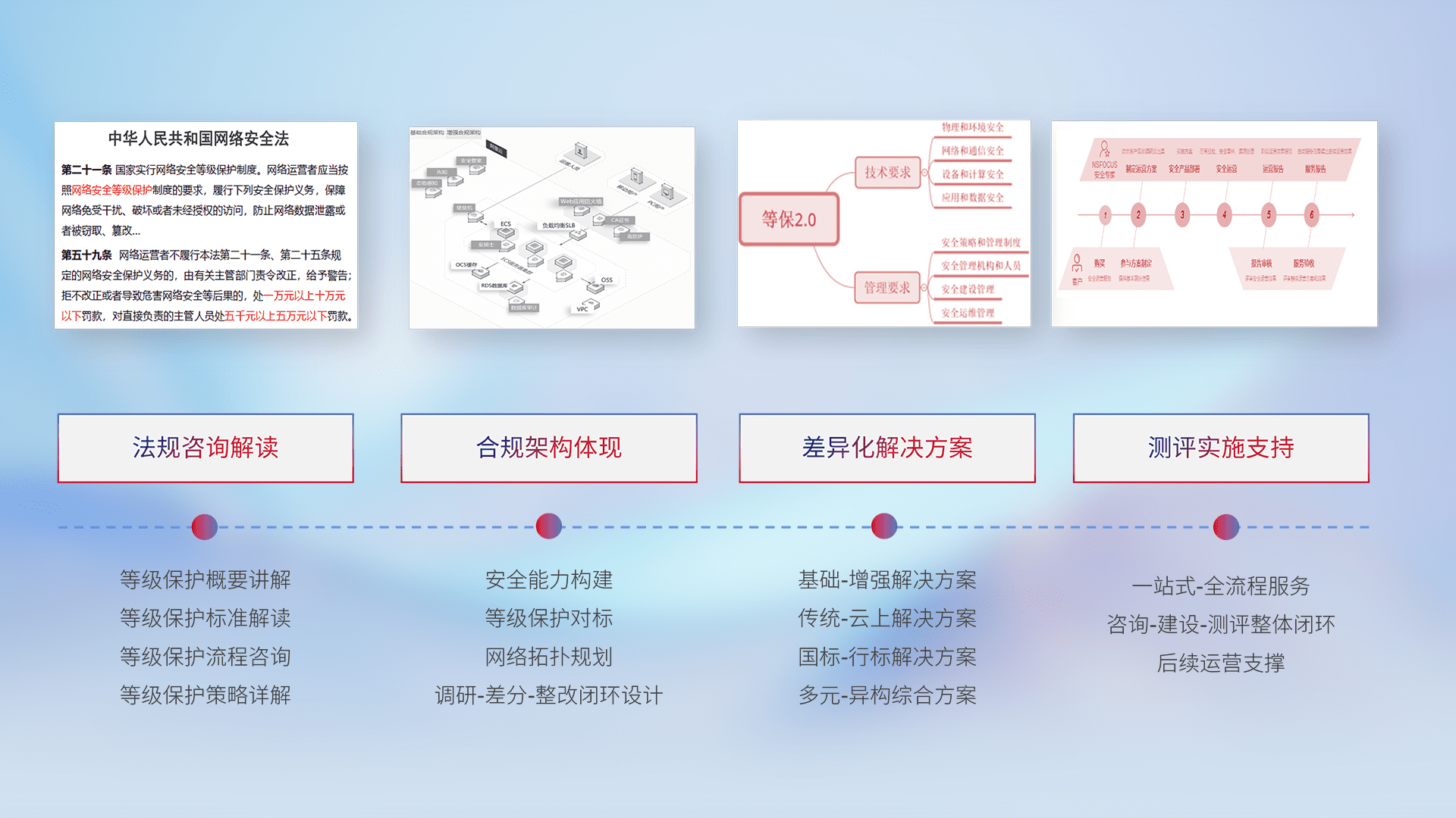 通过专业的法律咨询解读、、、合规架构体现、、、差异化解决方案、、、、测试实施支持等服务,,,为客户量身打造等保合规体系。。。