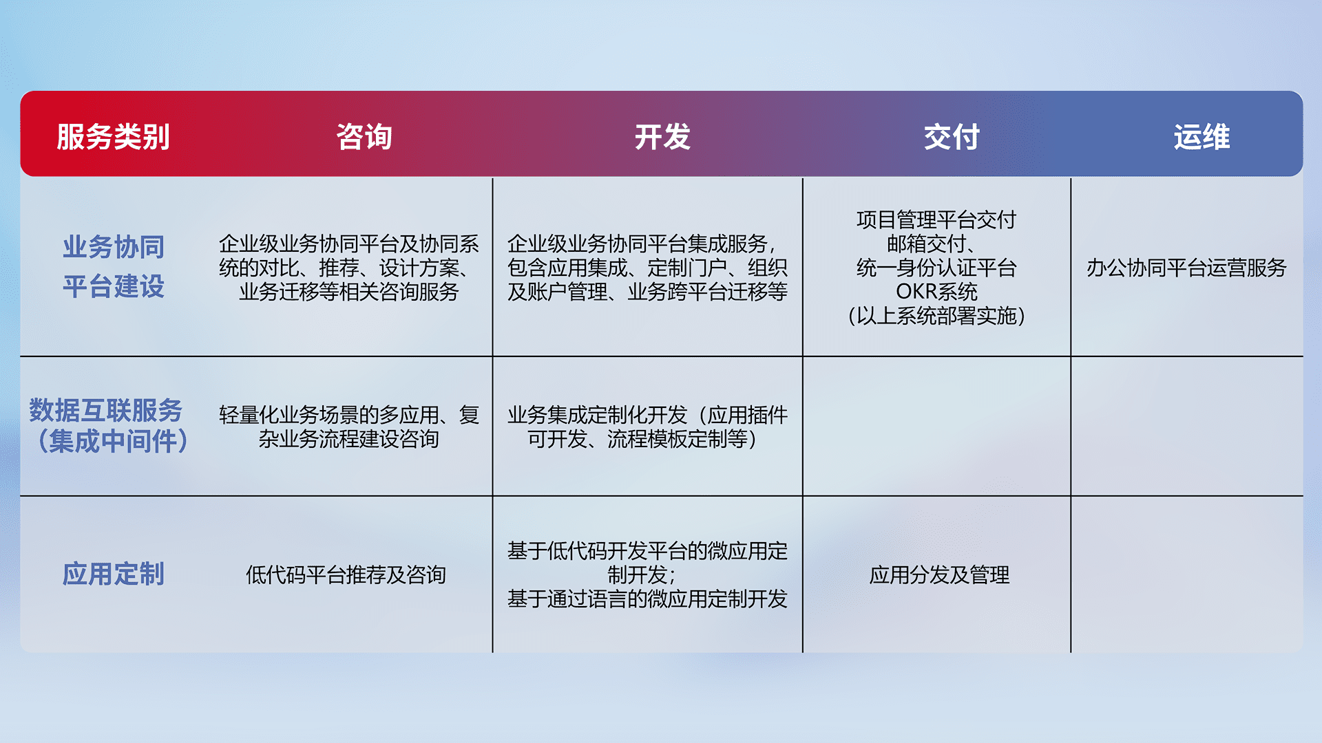 针对钉钉、、、企微、、IDaas等平台级产品提供产品的规划、、方案、、交付、、、定制化开发等服务,,,,实现如统一协同办公、、、智能客户服务、、混合会议管理、、智能数据查询、、、等业务场景,,,,实现数字化转型。。。。